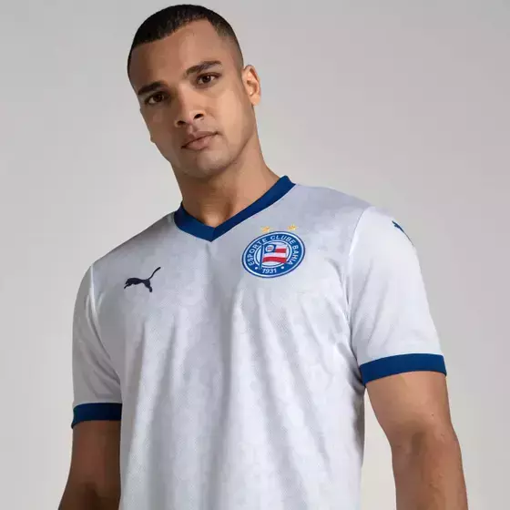 O visual traz o branco predominante com gola V e punhos em azul, além de um grafismo sublimado que remete às rendas típicas das baianas – uma homenagem à identidade cultural do estado. O escudo do Bahia vem bordado no peito, enquanto o logo da Puma aparece em azul, do lado oposto, reforçando o acabamento premium.