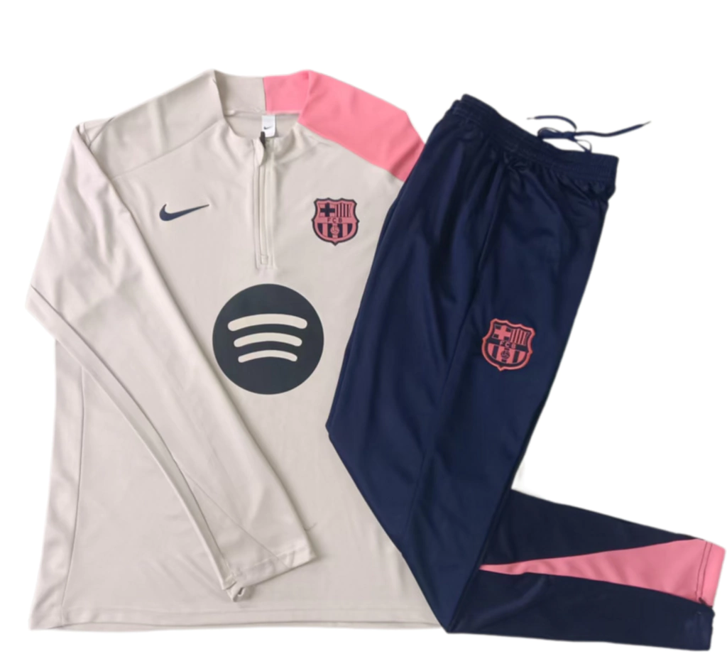 A jaqueta possui fechamento em zíper, gola alta e bolsos laterais funcionais, enquanto a calça tem modelagem slim, cintura elástica com cordão e punhos ajustados, garantindo liberdade de movimento e ótimo ajuste ao corpo. O escudo do Barcelona e o logo da Nike são aplicados com acabamento premium, reforçando a autenticidade do produto.